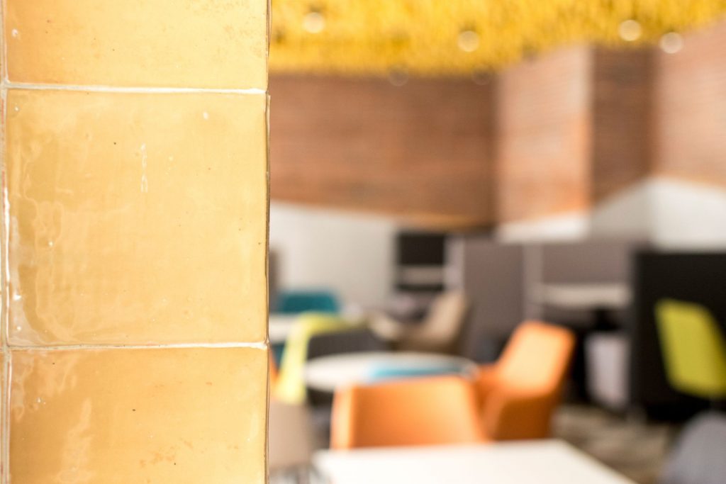 - Colores tropicales: Los tonos verdosos y amarillos dominan la ambientación de la cafetería, creando una atmósfera cálida y acogedora. El mobiliario, cuidadosamente seleccionado, complementa perfectamente los colores anaranjados del barro.